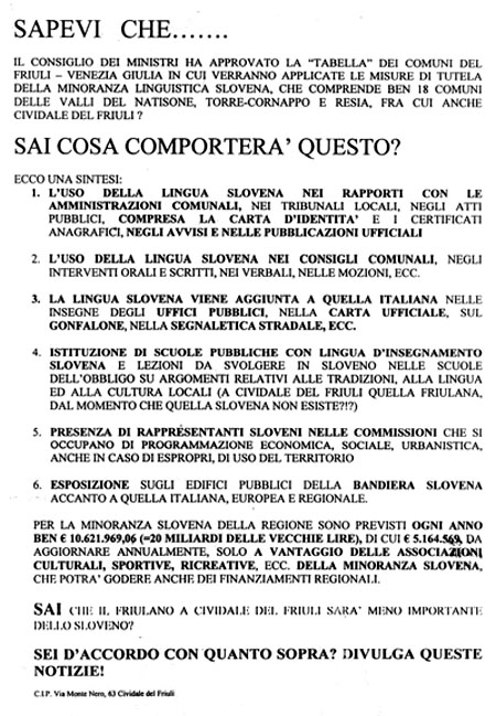 trascrizione del testo del volantino: Cittadini di San Pietro al Natisone - Basta! allo spreco di risorse per foraggiare la casta della minoranza slovena - La legge N° 482/99 e N° 38/01 volutamente e senza riscontri storici, imposta ai comuni del confine orientale, ha contribuito a gonfiare le tasche dei soliti noti senza beneficio alcuno per le popolazioni autoctone delle Valli in cui continua inesorabile il degrado, l'abbandono e l'esodo della cui continua l'abbandono e l'esodo della popolazione - Queste le cifre! - 2 (?) milioni di euro le risorse stanziate dallo Stato italiano - 30 mila euro per maggiori oneri alla scuola bilingue di San Pietro al Natisone (la Scuola Bilingue funziona come un istituto privato (?) ma gode di privilegi econimici e funzionali che alle altre scuole statali delle Valli non sono concessi ... come dire ...se vuoi i soldi devi dichiarati sloveno) - 100.000 euro dalla Regione per sostegno alle attività delle associazioni della minoranza slovena - noi chiediamo: il censimento della minoranza slovena in Provincia di Udine - sospensione di ogni finanziamento alle associaziuoni slovene vista la congiuntura economica mondiale - riconoscimento da parte della Regione delle varie parlate autoctone storiche esistenti - noi diciamo: No alla carta d'identità bilingue - no ai contributi alla scuola bilingue privata - no allo sportello bilngue - le popolazioni del Friuli orientale hanno origini antecedenti alle tribù autoctone del gruppo etnico sloveno - già nel VI secolo vi sono menzioni su popoli di origine slava al seguito dei longobardi, nelle memorie di Paolo Diacono - le nostre parlate, tramandate oralmente per secoli, sono considerate dagli storici e dagli studiosi di linguistica non ideologizzati di ceppo slavo ma non identificabili con nessuna altra lingua del XX secolo - chiediamo con forza il riconoscimento di tale peculiarità, la tutela per le nostre parlate, la nostra cultura, le nostre tradizioni e non l'importazione di quelle slovene che non ci appartengono - chiediamo un censimento della minoranza slovena in tutta la Provincia di Udine per smascherare l'ingiusta legge sulle minoranze linguistiche storiche presenti in cui non ci identifichiamo e che non tutela la nostra lingua - le popolazioni delle Valli hanno lottato fin dal primo Risorgimento per affermare la loro italianità dettata dalla storia e dal proprio sentimento di appartenenza - noi non ci venderemo per trenta denari! - se la pensi come noi, sabato 3 dicembre all eore 9.00, protesta con noi davanti al Municipo di San Pietro al Natisone, dove l'Istituto per la Cutura Slovena terrà un incontro pubblico per stravolgere l'appartenenza storica all'Italia delle nostre Valli (seguono i nomi del segretario provinciale della Fiamma Tricolore, di un assessore del Comune di Drenchia e del segretario della Fiamma Tricolore della sezione Cividale - Valli del Natisone)n