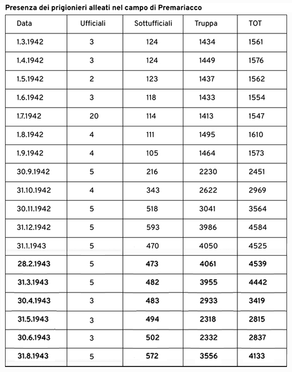 Si tratta di una delle fughe avvenute a cavallo tra l8 settembre 1943 e larrivo dei tedeschi di cui evidentemente non risulta relazione da parte del colonnello a capo del campo di prigionia. Alcuni prigionieri furono lavati, sfamati e sistemati alla meno peggio nel granaio (della famiglia Donato di Premariacco) dove rimasero per una decina di giorni.Da qui furono poi fatti fuggire attraverso le zone controllate dai partigiani nelle Valli del Natisone.