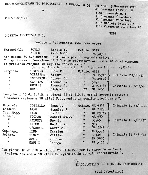 Many Italian soldiers were rewarded for preventing the escape of Allied soldiers. I know that some of these PW were seriously wounded and died later [ ]. The rewarding of Italian soldiers was instituted by the Camp Commandant Colonel Calcaterra and by reason of this inducement, I am sure the guards and sentries were much encouraged to shoot at PW for the slightest offence in order to gain a monetary reward. (9)